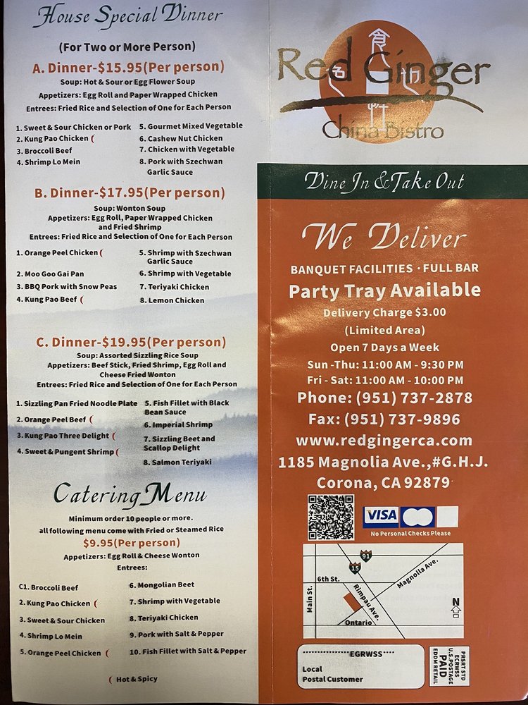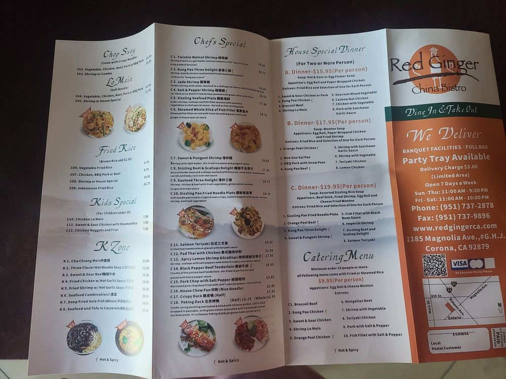 Red Ginger China Bistro, located in Corona, CA, offers a diverse menu with options for everyone. The restaurant provides a casual dining experience with vegan and vegetarian choices, along with a full bar and Wi-Fi accessibility. Customers praise the flavorful dishes, such as the Three Flavor Sizzling Rice Soup and the sweet and sour chicken. The attentive service and family-friendly atmosphere make this spot a favorite in the area. With generous portion sizes and affordable prices, Red Ginger China Bistro stands out for its authentic Chinese cuisine. Don't miss out on their Moo Shu options and be sure to say hi to Tom, a friendly member of the staff, when you visit. Whether dining in or ordering takeout, this restaurant's delicious meals and welcoming vibe will leave you satisfied and coming back for more.